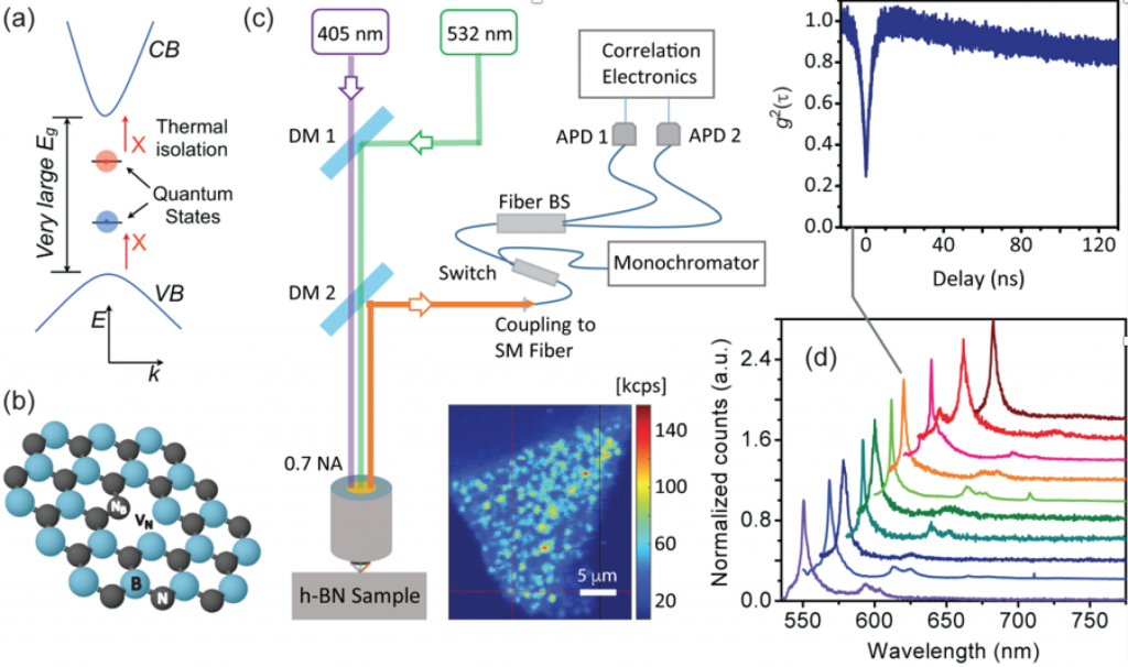 Fig. 1: (a) In a wide-bandgap semiconductor, the relevant energy levels of a point defect serving as a qubit lie within the material bandgap. The defect, therefore, can be looked at as a ‘virtual atom’. (b,c) Example color center in hBN, a ~6eV bandgap van der Waals material. We address single color centers in hBN using confocal microscopy (bright spots in the image, lower right). (d) Optical spectroscopy of individual, strain-shifted color centers in hBN. The upper inset is a typical auto-correlation trace, revealing single photon emitters.